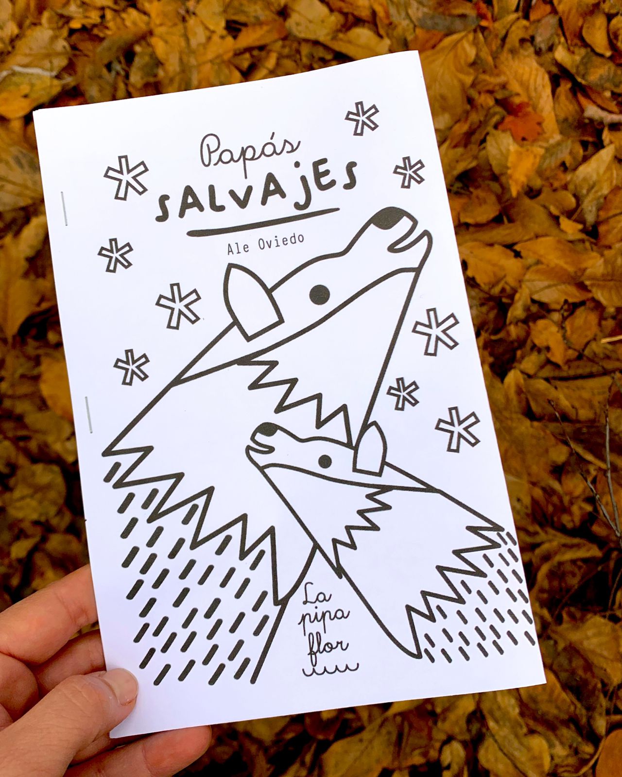 "papás salvajes" es un libro de cuatro ilustraciones con breves textos que nos cuentan sobre las características físicas y el rol que tienen en la crianza el gorila, el lobo, el león y el elefante.